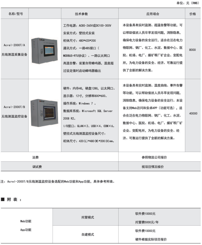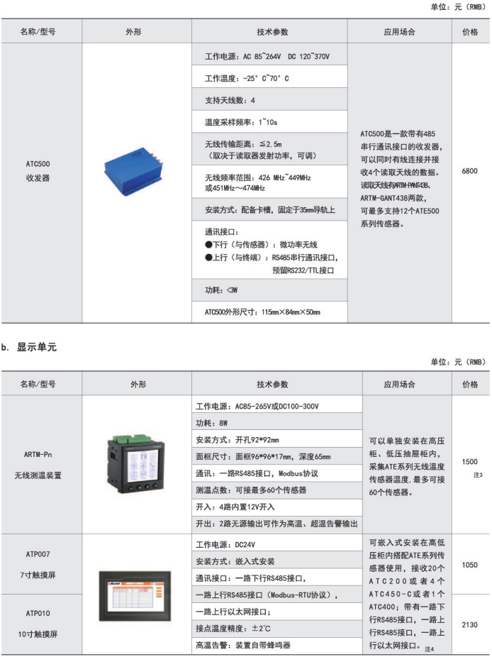 ARTM-Pn無線測溫裝置:ARTM-Pn無線測溫裝置可以單獨安裝在高壓柜、低壓抽屜柜內(nèi),每臺裝置可以接收18個傳感器的數(shù)據(jù),傳感器型號可選配ATE100、ATE200、ATE300。裝置帶有一路485接口,可將采集到的溫度數(shù)據(jù)上傳到監(jiān)控中心。應用范圍: