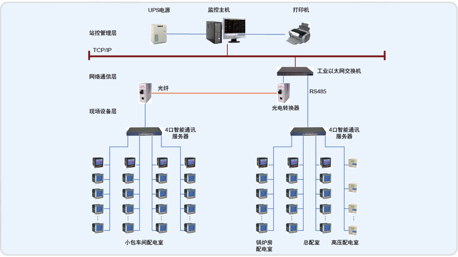 廠區(qū)配電中心為本項目提供一套高、低壓后臺監(jiān)控系統(tǒng),將廠區(qū)3臺變壓器的各主進(jìn)線柜、出線柜、各低壓回路的開關(guān)配多功能智能儀表。能進(jìn)行用電量計量;實時測量相電壓、線電壓、有功功率、無功功率、視在功率、功率因數(shù)、頻率等數(shù)據(jù),能打印月度用電報表,并有歷史曲線的查詢(時間不小于30天),重要回路需要對其諧波進(jìn)行測量。各參數(shù)及數(shù)據(jù)通過RS485總線,通過網(wǎng)絡(luò)送至配電中心的電工值班室(后臺監(jiān)控中心)。電力監(jiān)控組態(tài)軟應(yīng)具有方便、靈活的開發(fā)環(huán)境,提供各種工程、畫面模板, 高性能實時、歷史數(shù)據(jù)庫,支持報警、事件網(wǎng)絡(luò)數(shù)據(jù)斷線存儲,恢復(fù)功能;提供的報表操作函數(shù)集、支持復(fù)雜腳本控制,包括:腳本調(diào)用和事件腳本,可以提供報表設(shè)計器,可以設(shè)計多套報表模板。