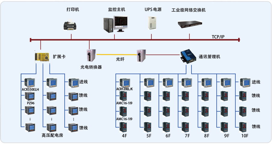 整個系統采用分布式結構,在上海東方電視臺變電所監控室放置監控主機及通訊采集裝置,現場各回路的儀表采用屏蔽雙絞線以總線型方式連接至通訊采集裝置,通訊管理機連接至交換機,其中劇場中設備用光纖連接至監控室。