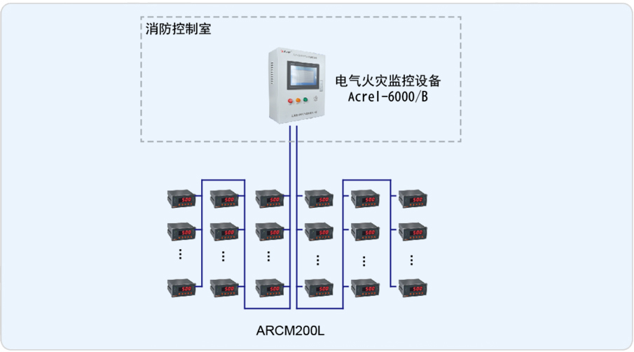 安科瑞于2014年9月承接了該項(xiàng)目電氣火災(zāi)監(jiān)控系統(tǒng),整套系統(tǒng)由壁掛式電氣火災(zāi)監(jiān)控裝置安科瑞Acrel-6000/B、ARCM200L剩余電流式火災(zāi)探測(cè)器組成。現(xiàn)場(chǎng)低壓配電柜內(nèi)探測(cè)器采用2條485總線接至消控中心的Acrel-6000/B壁掛式電氣火災(zāi)監(jiān)控系統(tǒng),當(dāng)現(xiàn)場(chǎng)保護(hù)線路中的被探測(cè)參數(shù)超過報(bào)警設(shè)定值時(shí),發(fā)出報(bào)警信號(hào)、控制信號(hào),指示報(bào)警部位并保存報(bào)警信息。