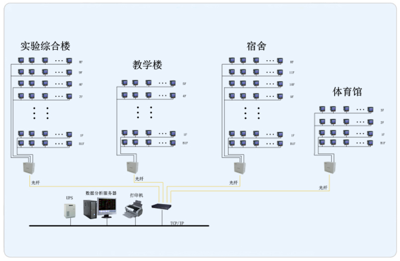 安科瑞Acrel-5000建筑能耗分析管理系統(tǒng)根據上海復旦中學西部校區(qū)現場實際情況,整體網絡結構采用屏蔽雙絞線直接接至樓層弱電井的數據采集器然后通過光纖將數據上傳至的監(jiān)控主機。該系統(tǒng)主要采用分層分布式計算機網絡結構,站控管理層、網絡通訊層和現場設備層。