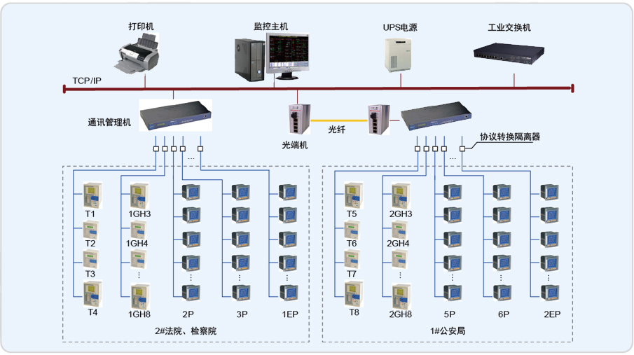 該項目有1#(公安局)、2#(法院、檢察院)兩個變配電室,室內的配電柜中安裝了安科瑞332塊PZ系列可編程智能電測表。為了能夠實現(xiàn)電力參數(shù)實時遙測、電能計量、電能報表等功能,系統(tǒng)采用Acrel-3000電能管理軟件,做到集中管理、集中控制,省去了值班人員現(xiàn)場抄表的煩瑣,具有投資少、簡明實用、便于智能管理等優(yōu)點。