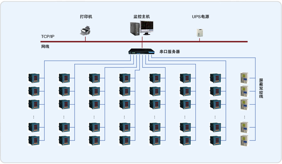 Acrel–2000軟件通過中間采集設備采集現場電力監控儀表數據,并在系統一次圖顯示出來。主要實現功能如:遠程抄表查,詢各個配電室各個回路按照時間段進行歷史數據查詢。趨勢曲線,功率實時趨勢顯示及歷史趨勢查詢功能。系統遙信狀態報警,根據本系統的設計意圖,如果重要回路或者照明回路三相中某一相電流負荷超過額定值的90%,系統必須立刻發出聲光報警并彈出指示框指明報警源,提醒管理人員注意負載的三相平衡和負載率,同時自動記錄事件發生的時間和回路名稱,以便用戶查詢,追憶故障原因。