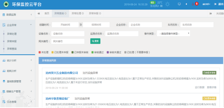 通過關聯分析、超限分析、啟停時間分析,及時發現環保治理設備未開啟、異常關閉及減速、空轉、降頻等異常情況,同時通過數據分析還可以實時監控限產和停產整治企業運行狀態,如圖所示: